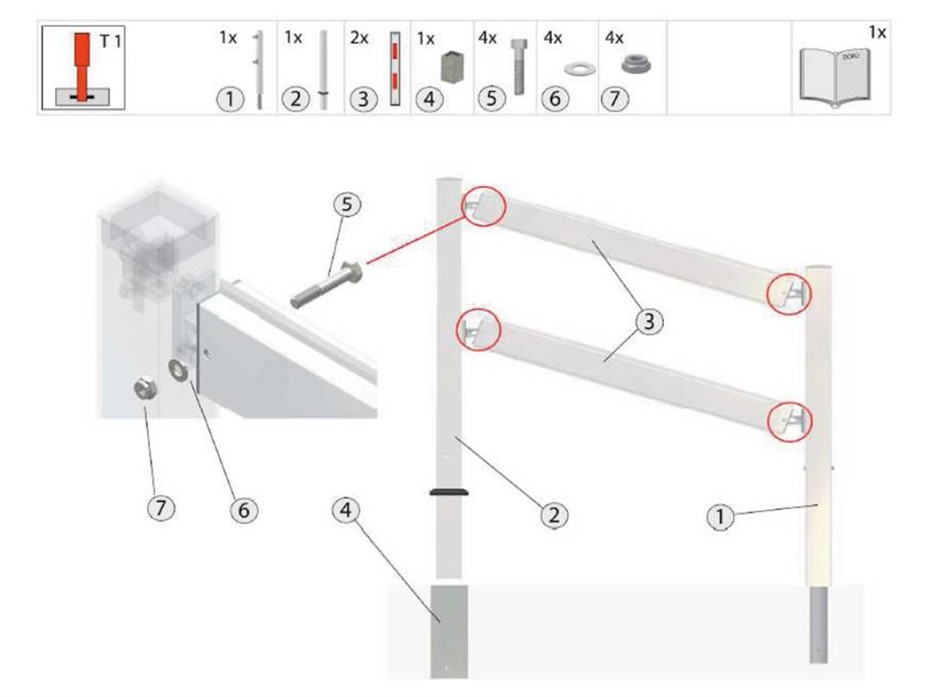 1 słupek do zabetonowania (obrotowy), zalecana głębokość osadzenia ca 300 mm. 1 słupek wyjmowany z tulei (zamykający). Aby otworzyć zaporę należy podnieść słupek zamykający z tulei a następnie przekręcić go wokół słupka obrotowego.